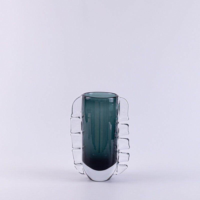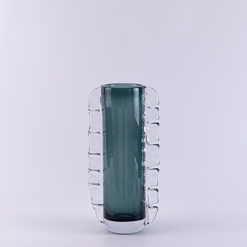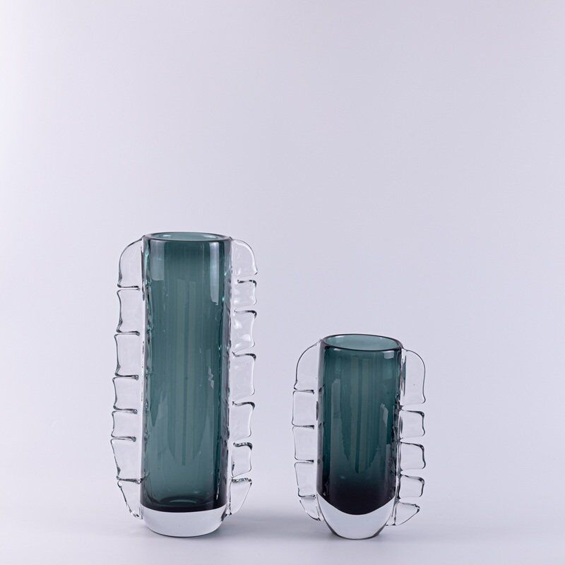 Bring timeless elegance into your home with this handcrafted artistic glass vase, featuring a deep smoky green core framed by sculptural clear glass ribs. This contemporary piece merges Nordic minimalism with artistic expression, making it the perfect statement for coffee tables, shelves, or dining spaces.